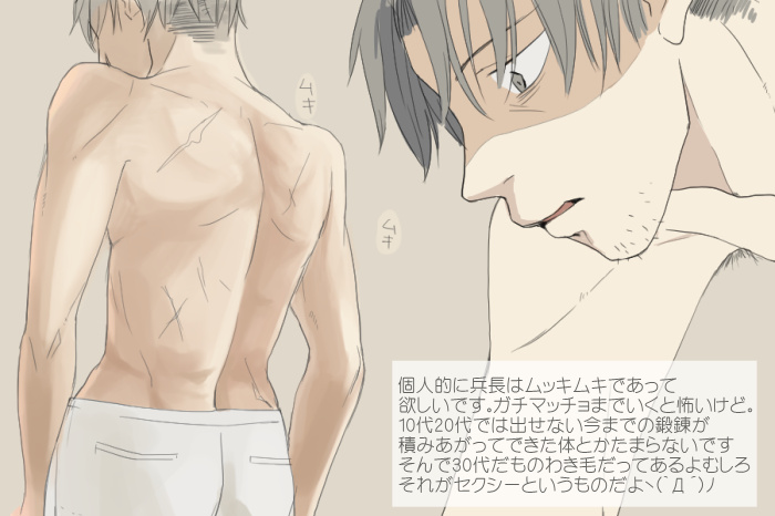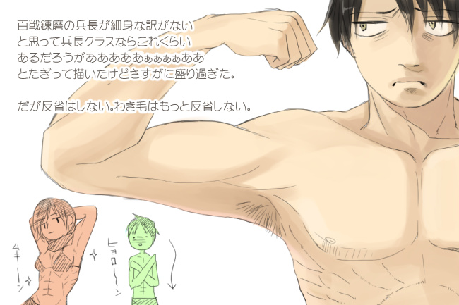 というわけで何が言いたいかというと、小柄だってもあれだけの戦闘能力を誇るリヴァイ兵長はやっぱり筋肉がっしりでわき毛の一本だって生えているわ!という話です。